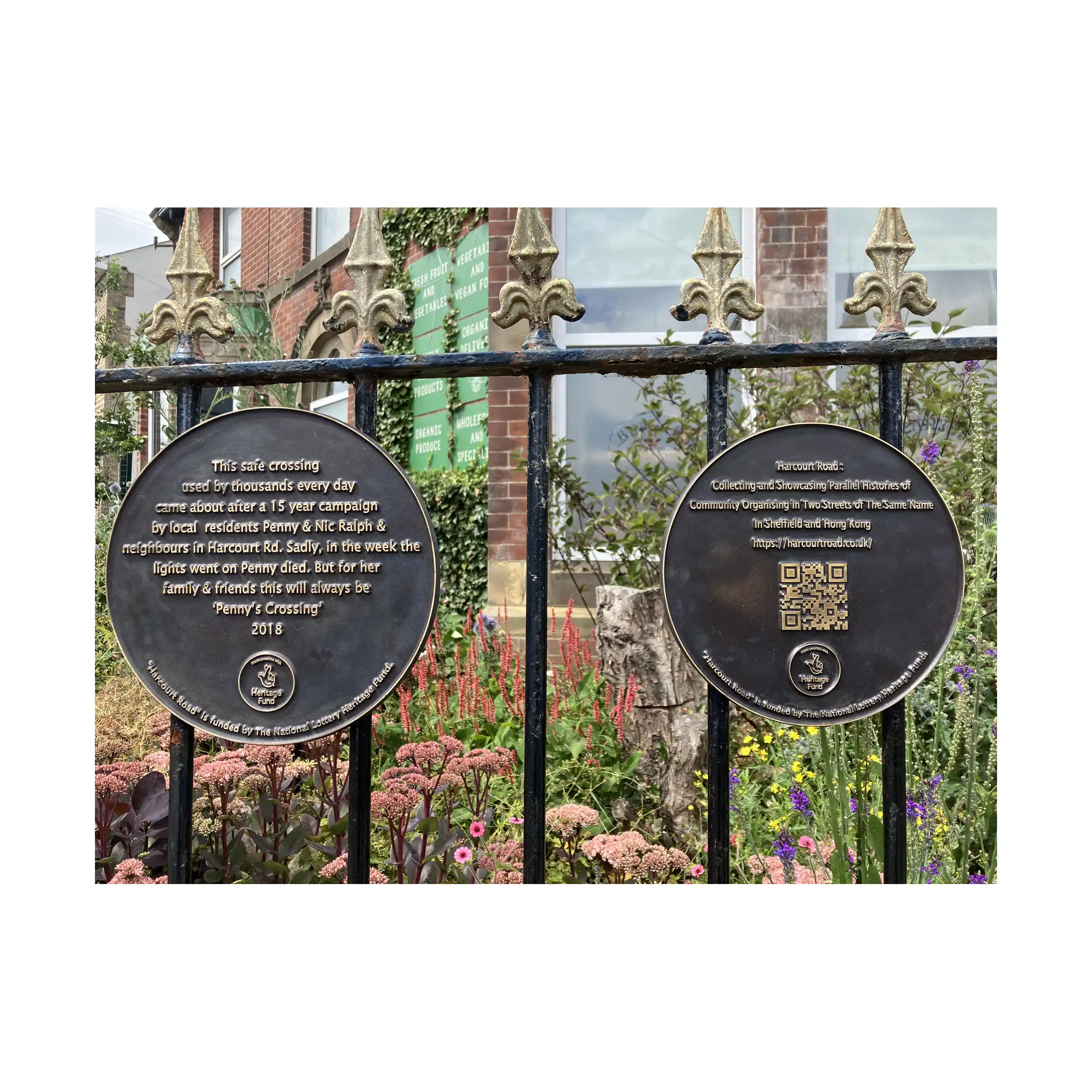 To celebrate community spirit and honour local heroes along Harcourt Road—both in Sheffield and Hong Kong—a commemorative plaque featuring a QR code linking to this website is installed on Sheffield's Harcourt Road.